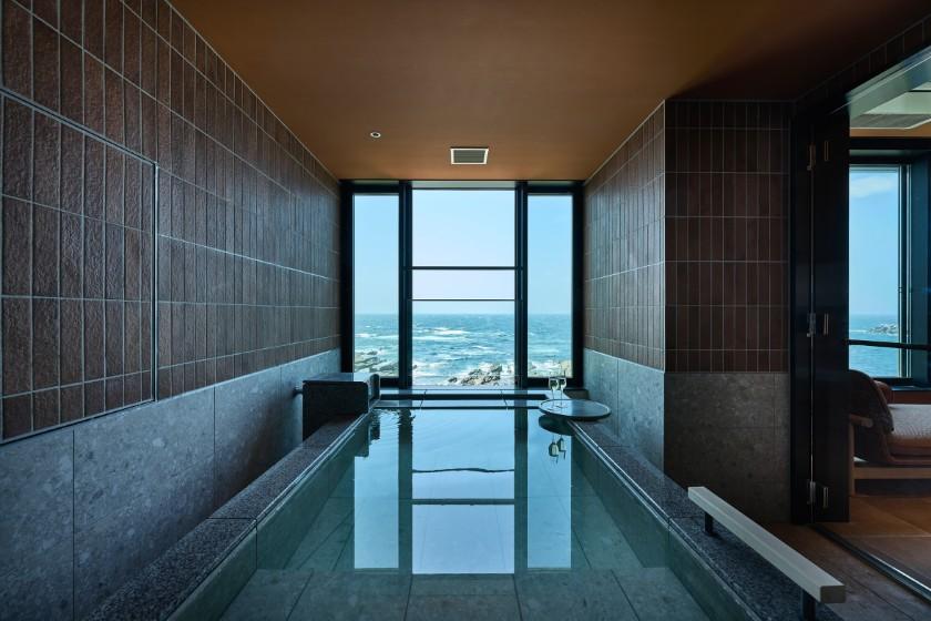 - 所有客房均設有可眺望大海的溫泉。聆聽海浪聲,在溫泉中放鬆身心。溫暖的海水和輕柔的海風,將使您的身心徹底放鬆。